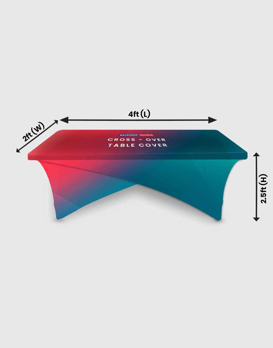 These covers are easy to install, ensuring a clean and professional presentation while also offering practical benefits such as table protection and the ability to conceal storage underneath. Cross-over Stretch Table Covers can be customized with logos, event messaging, or branding using high-quality printing methods like dye-sublimation, making them perfect for businesses looking to promote their brand at events. Durable, flexible, and easy to maintain, they provide both style and function in any setting.