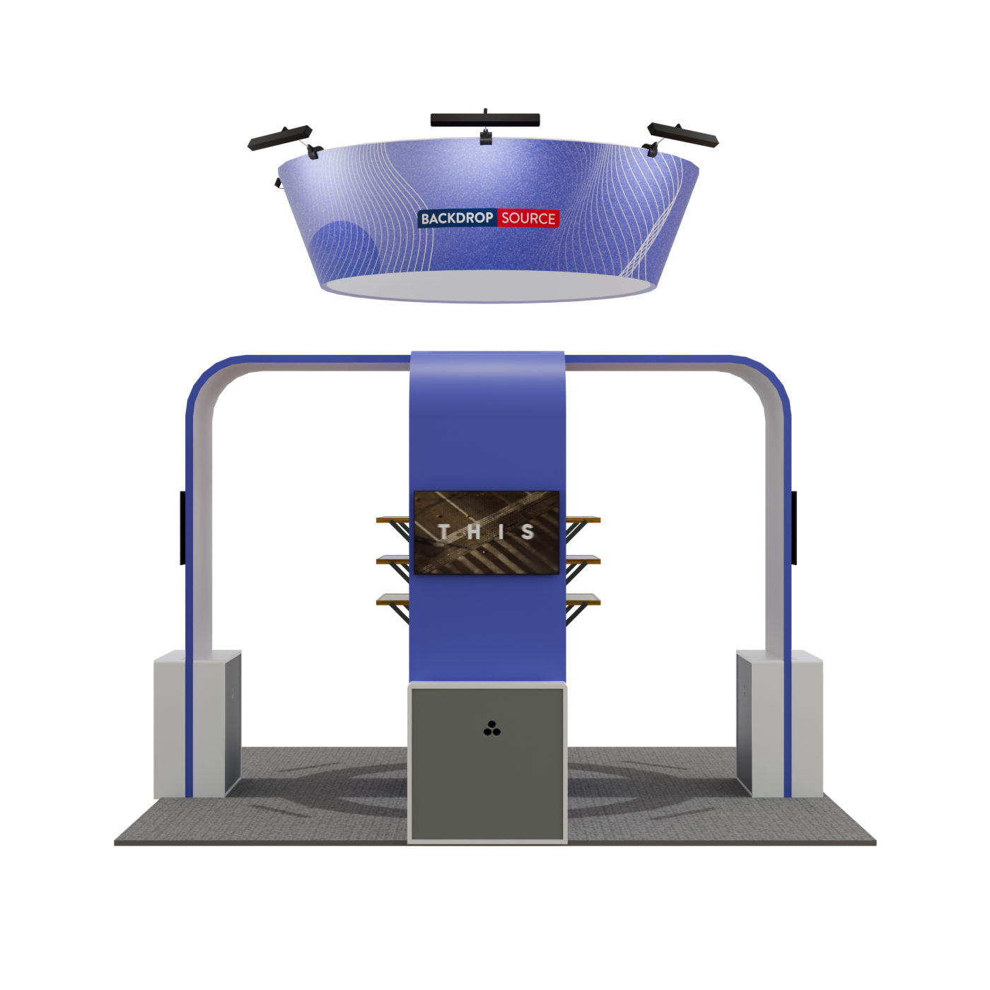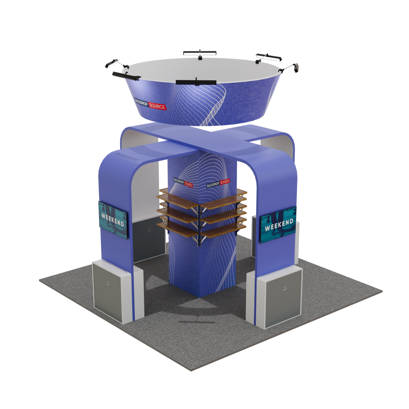 - L Arch Display with TV Mount : A dynamic arched structure combining sleek fabric printing with a built-in TV mount—great for interactive demos or digital displays.