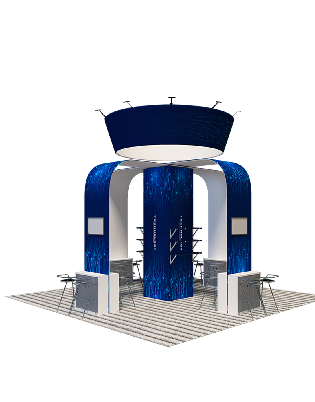 - Round hanging banner boosts booth visibility from across the exhibition floor