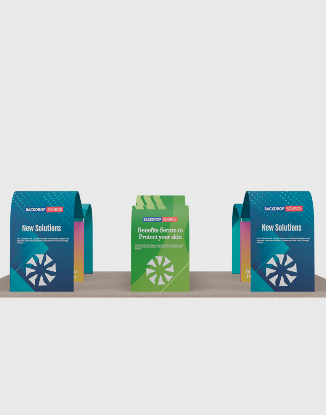 - Three wave arch stands create a visually dynamic and immersive booth structure