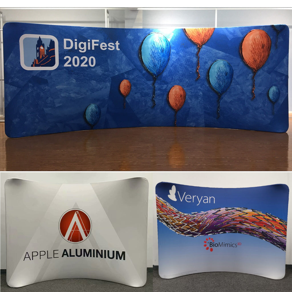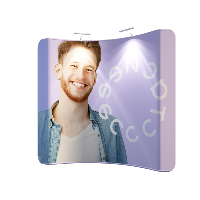 The Curved Tension Fabric Media Wall Display is a stylish and professional solution for enhancing your brand presence at trade shows, exhibitions, and events. Featuring a sleek curved design, it offers a modern aesthetic that draws attention from every angle. The lightweight aluminum frame is easy to assemble without tools, while the high-resolution tension fabric graphic ensures vibrant, wrinkle-free visuals. Ideal for creating impactful backdrops, step-and-repeat media walls, or promotional displays, this system is portable, durable, and fully customizable to suit your branding needs.