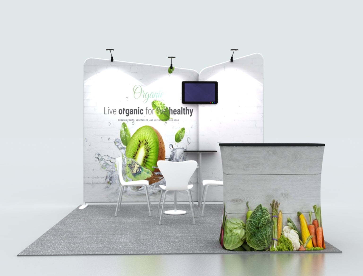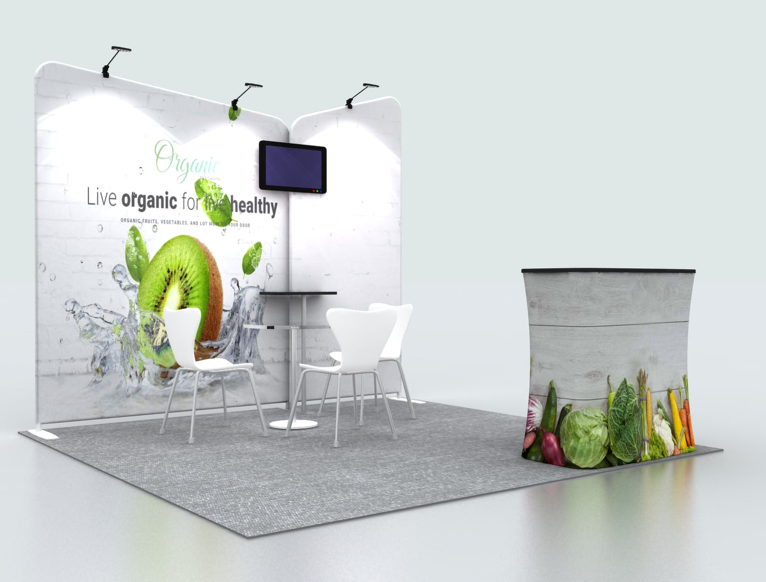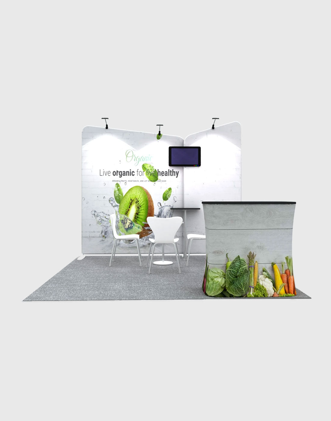 The Inclined Exhibition Kit for 10ft Wide Booths is a sleek, modern display solution designed to make a bold statement at trade shows and events. Featuring a unique inclined design, this kit maximizes booth space by creating an engaging, multi-dimensional layout that attracts attention from all angles. The kit includes a custom backdrop with high-quality, seamless graphics, providing a professional environment for branding or promotional messages. The inclined structure allows for dynamic product displays or interactive elements, while integrated shelving or counters provide functional space for showcasing materials or products. Easy to assemble with a lightweight, tool-free frame, the Inclined Exhibition Kit offers flexibility and visual impact in a compact, 10ft-wide booth. Perfect for exhibitors looking to stand out and captivate their audience.